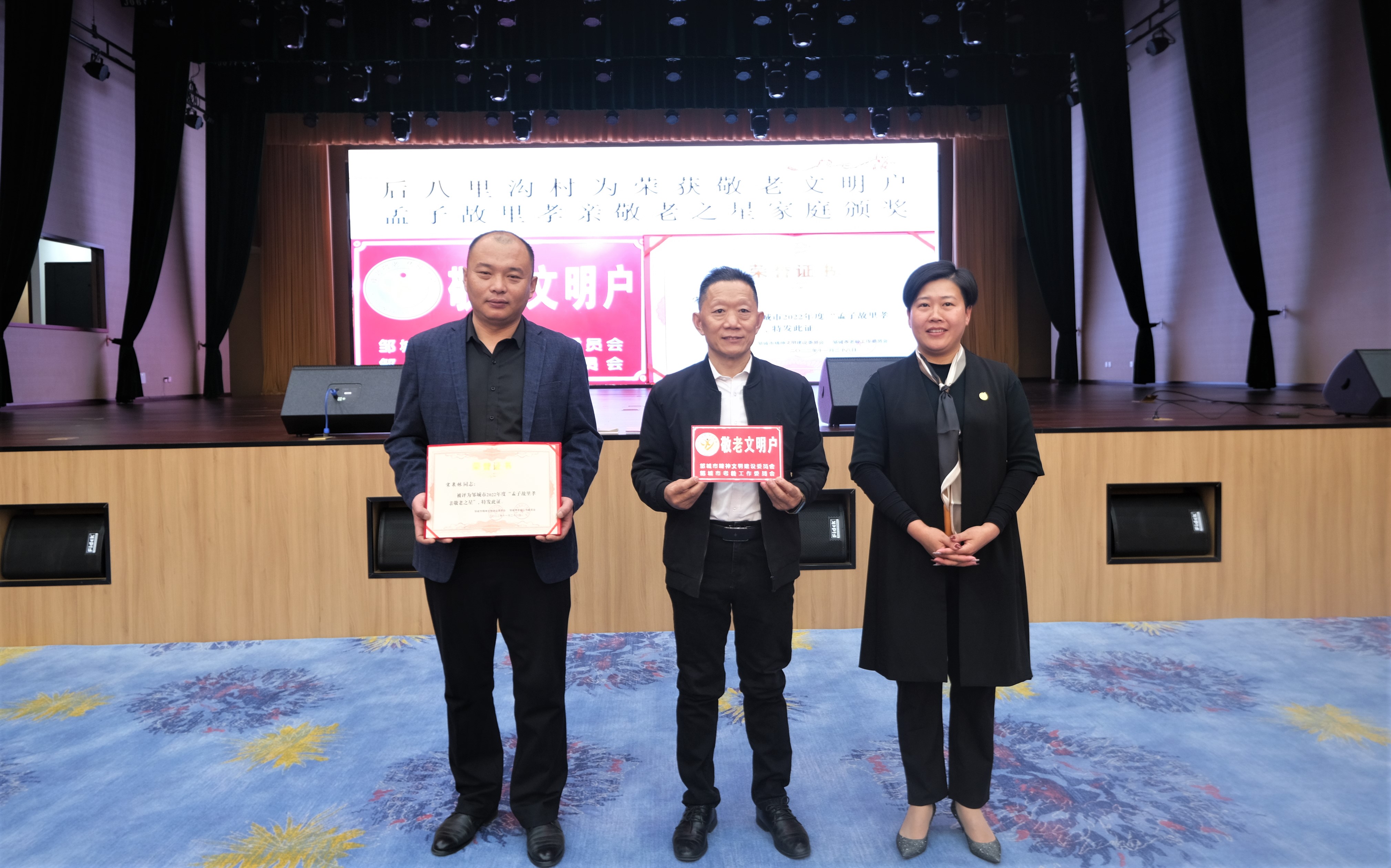 为邹城市敬老文明户宋长锦家庭、孟子故里孝亲敬老之星宋泉林颁奖