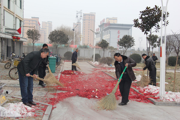 年初二,整个小区所有路面都布满了爆竹碎屑。天刚蒙蒙亮,我村村民代表和党员宋瑞芳、付贞二十余人就带着大扫帚在南门口集合,当时气温还较低,他们不怕寒冷,和村两委成员一起参加了清扫活动。他们将人员分为四组,东西区各两组,开始仔细地打扫垃圾。到八点半,就将所有垃圾都扫成堆,村民代表宋长良主动回家开来自己的三轮车,将一堆堆垃圾装车运走,直到近十一点才结束。这是一次自动自发的义务劳动,通过这次活动,再次展现了村民代表的高尚情操。在此,村委会对他们提出表扬,并号召广大村民向他们学习。